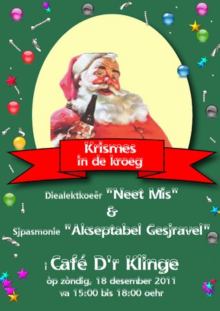 Dialectkoor Neet Mis en Sjpasmonie Akseptabel Gesjravel hebben de handen ineen geslagen en organiseren samen een Kerstmiddag. Onder het motto ‘Krismes i de Kroeg’ vindt er op zondag 18 december een gezellige middag plaats in Café D’r Klinge aan het Pancratiusplein in Heerlen. Het begint allemaal om 15.00 uur en duurt tot 18.00 uur. Natuurlijk hoeft men daarna niet naar huis te gaan, maar het officiële gedeelte is dan afgelopen.