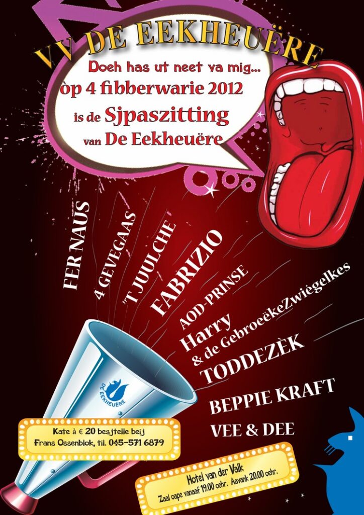 De jaarlijkse activiteiten rondom de elfde van de elfde barsten weer los. Zo ook in het Heerlense Eikenderveld. Traditiegetrouw op de eerste zaterdag na 11 november openen De Eekheuëre het nieuwe carnavalsseizoen. Vanaf 21.00 uur is iedereen van harte welkom in Trefcentrum ’t Loon. Daar zal DJ Mathijs de heerlijke carnavalsmuziek weer laten klinken en bovendien maken enkele Heerlense artiesten hun opwachting. De Dörpsgekke, De Drinkbülle en het Garderezjiment D’r Kuëb va Heële hebben hun komst al toegezegd. En natuurlijk ontbreekt duo Vee & Dee niet, die voor hun thuispubliek graag de nieuwe sjlager ‘Doeh has ut neet va mig’ presenteren. De Eekheuëre hopen op uw komst. Voor de entreeprijs hoeft u het niet te laten, want de toegang is gratis.