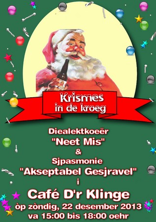 Dialectkoor Neet Mis en Sjpasmonie Akseptabel Gesjravel hebben opnieuw de handen ineen geslagen en organiseren samen voor de derde maal alweer een Kerstmiddag. Onder het motto ‘Krismes i de Kroeg’ vindt er op zondag 22 december een gezellige middag plaats in Café D’r Klinge aan het Pancratiusplein in Heerlen. Het begint allemaal om 15.00 uur en duurt tot 18.00 uur. Natuurlijk hoeft men daarna niet naar huis te gaan, maar het officiële gedeelte is dan afgelopen.