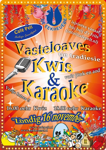 Voor de vierde keer op rij organiseerden De Eekheuëre samen met Frits Pelt de vasteloavendsquiz en het karaoke. Niet al te serieus natuurlijk en niet van landsbelang, want deze activiteit haalt het NOS journaal niet. Dat komt omdat carnavalisten niet zeuren over de kleur van de schmink … De enige voorwaarde is dat er rood, geel, groen bloed door je aderen stroomt. Nou en dat zat wel snor bij de quizzers en de zangers.
