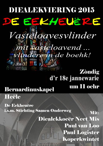Alweer voor de negentiende keer gaat het gebeuren. De Vasteloavendsvereniging De Eekheuëre en de Stichting Samen Onderweg organiseren zondag 18 januari 2015 weer een dialectviering. Daarmee houdt een lange traditie stand. Om 11.00 uur in de Bernardinuskapel aan de Akerstraat in Heerlen begint de Eucharistieviering.