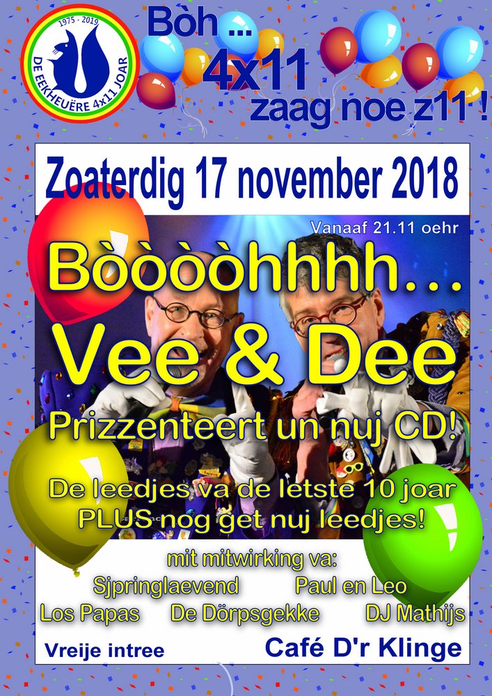 Zondag om 11.30 uur is de Diealektviering in de Pancratiuskerk en zondagmiddag vanaf 14.11 uur is iedereen present in Café D’r Klinge voor de bekendmaking van de Poeffel Moeffel 2019 door de Aod-Prinse. Voor meer informatie kunt u terecht op de Eekheuëre Facebookpagina en op onze website.